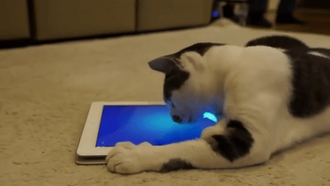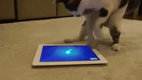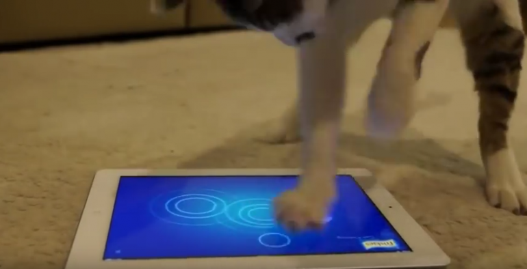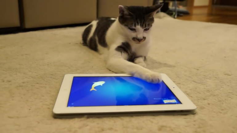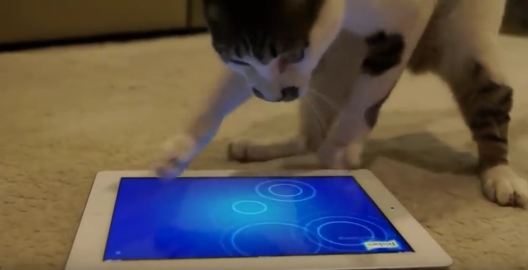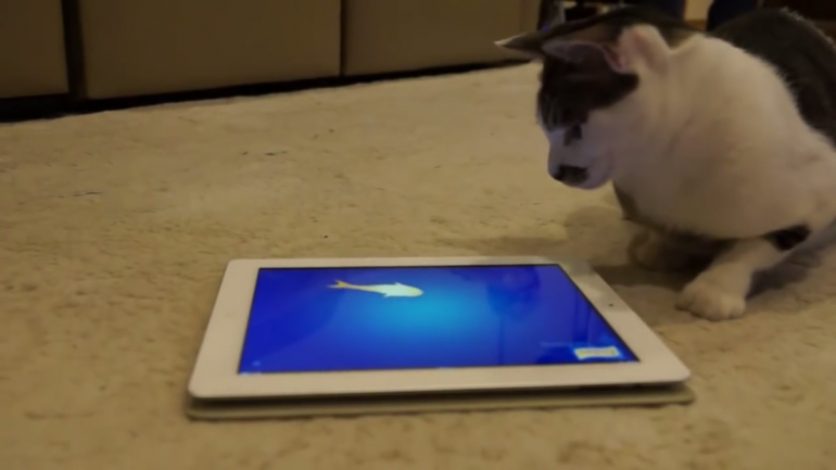 電子タブレットの画面におさかなが現れてビックリするネコちゃん。