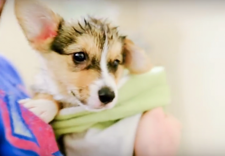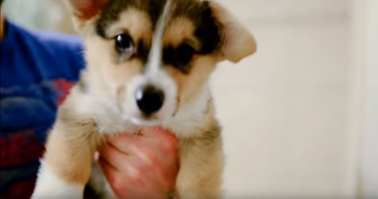 飼い主さんに抱きかかえられているワンちゃん。