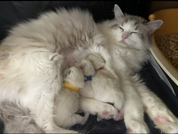 生まれたての赤ちゃんは目が開いておらず耳も聞こえない為、感覚だけを頼りにお母さんの元へ向かいます。ここでお乳を上手に吸えると一安心。初乳には赤ちゃんを守ってくれる成分が含まれているので、うまくお乳が吸えなかったり、子猫の頭数が多い場合は人間がサポートして誘導します。