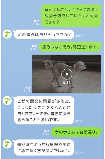 LINEでアニコムを友だち追加し、「どうぶつホットライン」に相談内容を入力すると獣医師などからの回答が届きます。病気や病気の予防に関することから、しつけや食事などの身近な悩みまで相談が可能。LINEなので、動画や写真を見てもらうこともでき、しっかりとアドバイスが受けられます。※