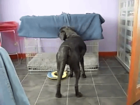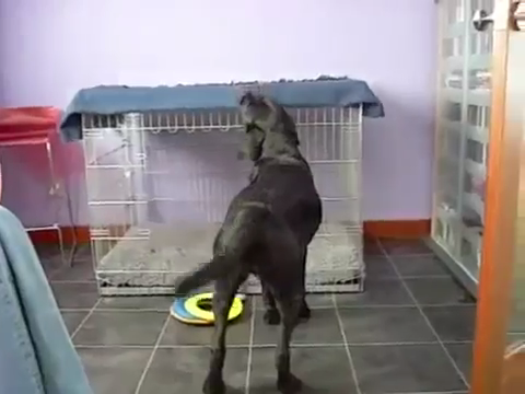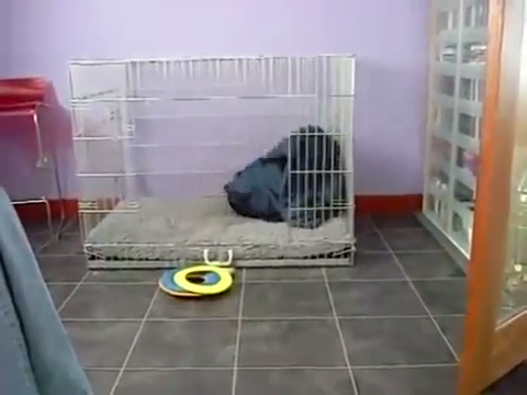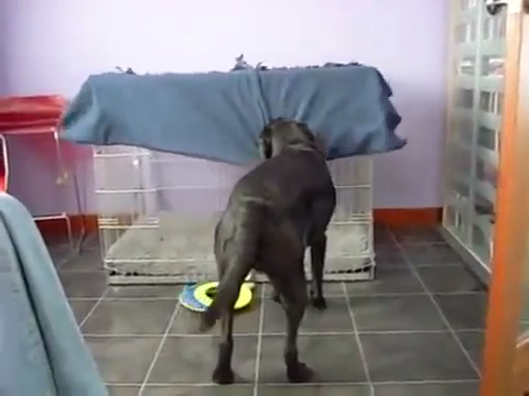 おもむろに、ケージのカバーをカプリとくわえるワンコ。