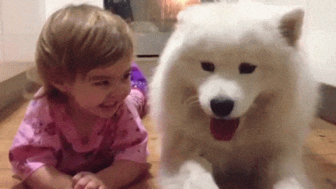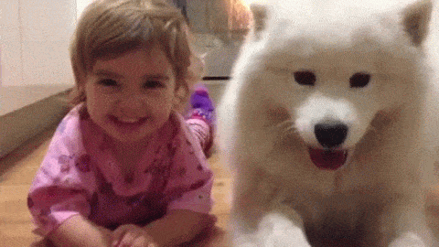 女の子と真っ白なサモエドのワンちゃんがふたりならんでニコニコ♪