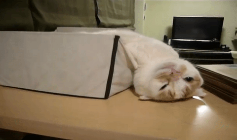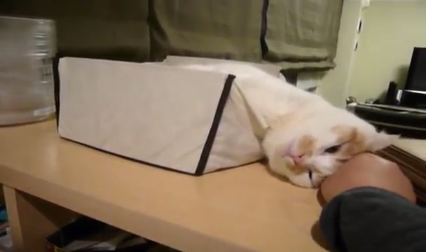 飼い主さんの手が来ても、箱に入ったまま甘えます。