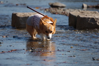 お散歩は陸だけじゃない!? 浅い水辺でお散歩を楽しむいーちゃん! お水の流れる音や冷たさなど、普段なかなか感じることができない貴重な体験ですね♡ (いーちゃん、7歳、ウェルシュ・コーギー・ペンブローク)