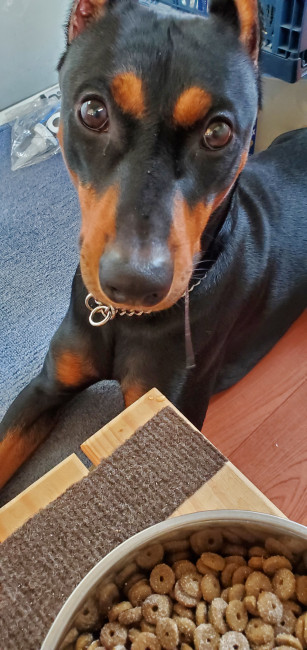 ごはんが待ちきれないのは、ジャーマンピンシャーのダンクくん。うるうるの瞳で飼い主さんを見つめています。早くごはんを食べたいと言っているのが、その表情とよだれの長さから伝わってきます。 (ダンクくん、3歳、ジャーマンピンシャー)