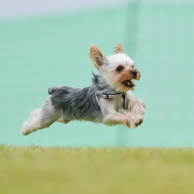 見事な飛行をしているのは、ヨークシャーテリアのルーカスくん。その笑顔が、とってもステキです♪ 風を切って走るのが、楽しいのかもしれませんね!(ルーカスくん、3歳、ヨークシャーテリア)