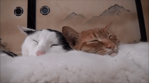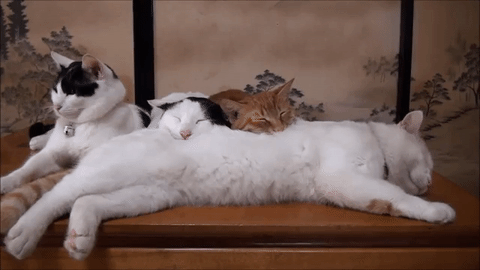 ふわっふわのまくらの上で、なかよく眠りにつくねこちゃんズ。