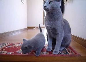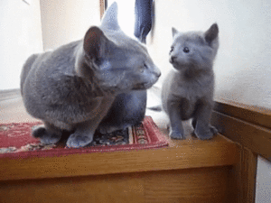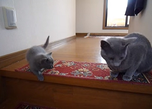 階段の近くでおすわりしているロシアンブルーの姉弟♡