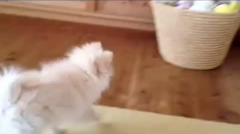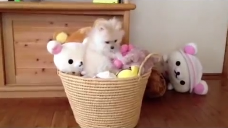 テクテクと、バスケットに近づくポメラニアンの赤ちゃん☆