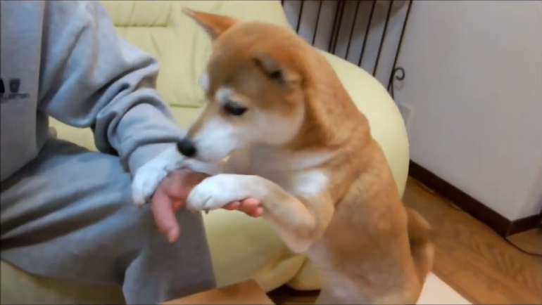 パパさんの手をぎゅむぎゅむして…