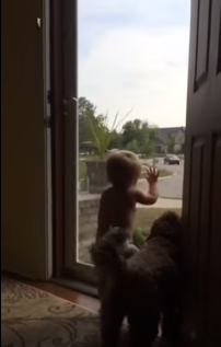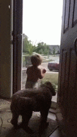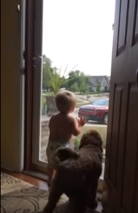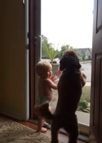 赤ちゃんとワンちゃん、ふたり仲良く外を眺めていると