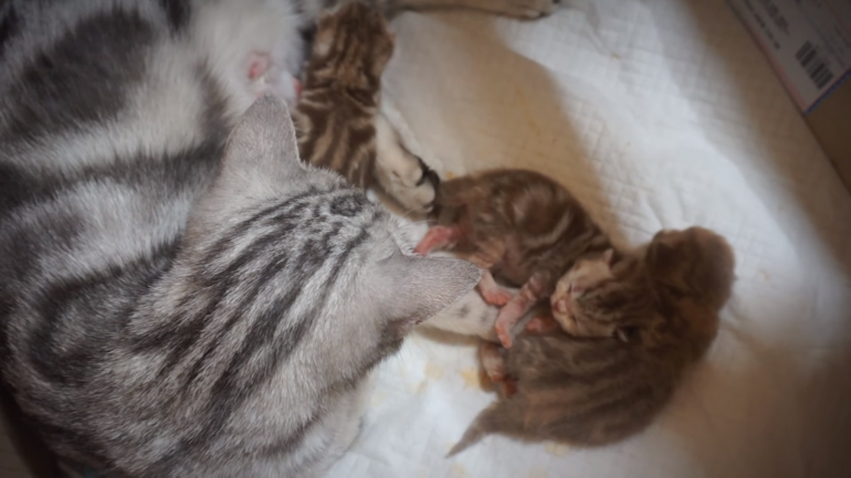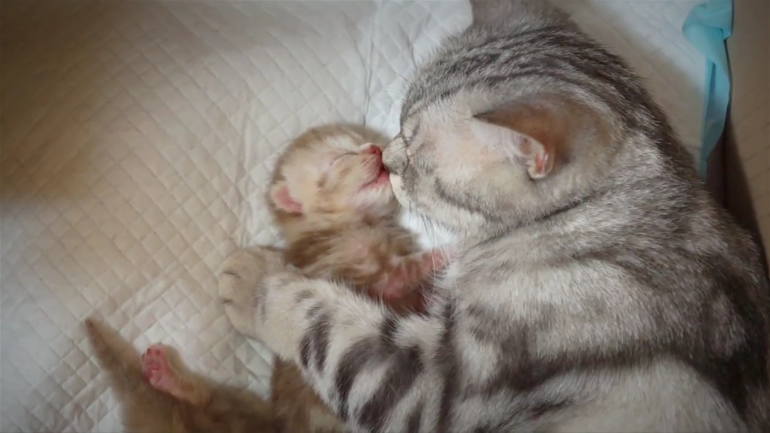 生まれたばかりの赤ちゃんねこを優しく見守るママねこ。