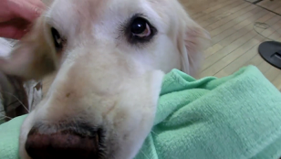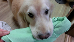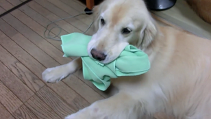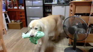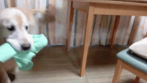 タオルをくわえて、お部屋じゅうをあっちにうろう…