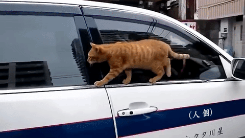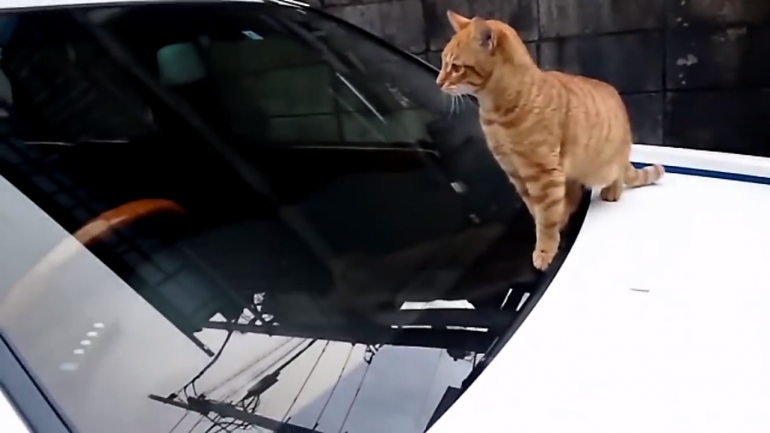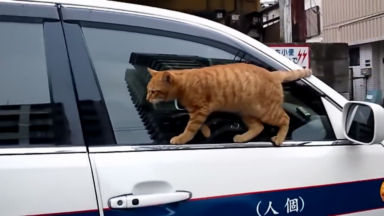 タクシーのボンネットに乗っかっているネコちゃん。
