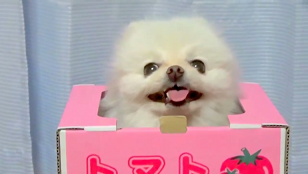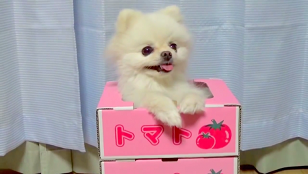 ポメちゃん、トマト箱の中からごあいさつ~♡