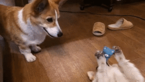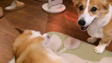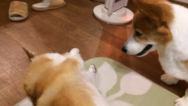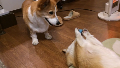 おもちゃを妹に取られてしまった兄コーギー。