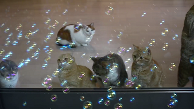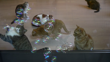 ネコちゃんたちの前に現れたのは、たくさんのシャボン玉!