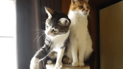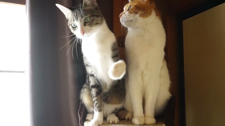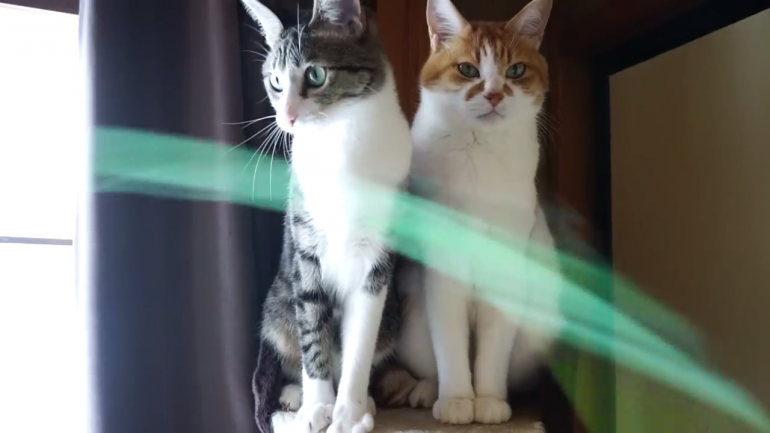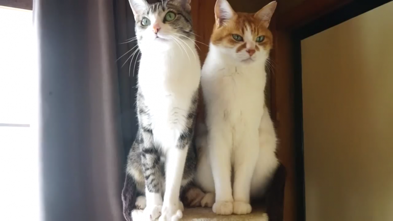 なかよくお座りするおはぎちゃんとアミ太郎くん。