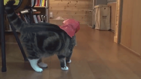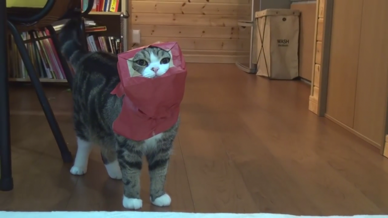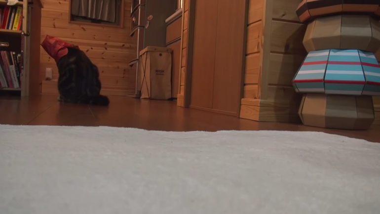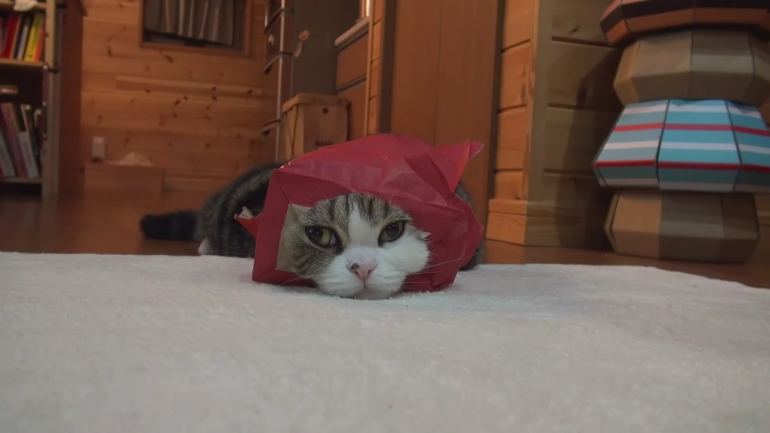 赤い紙袋をかぶり、ぐでーんとしているまるくん。
