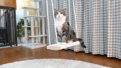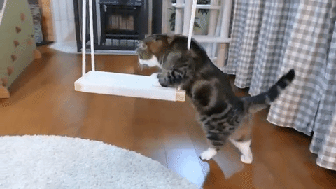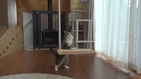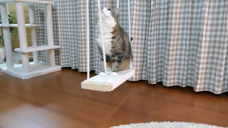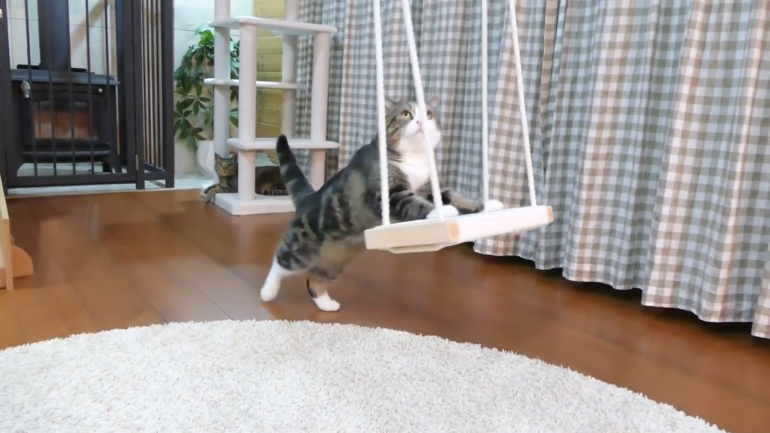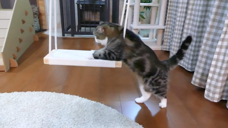 ブランコに手をかける、ニャンコのまるくん。