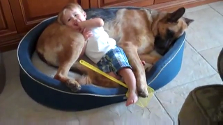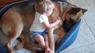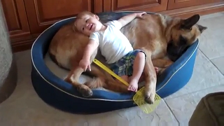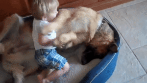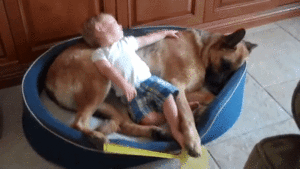 シェパードさんにもたれかかるジャックくん。