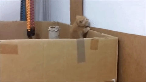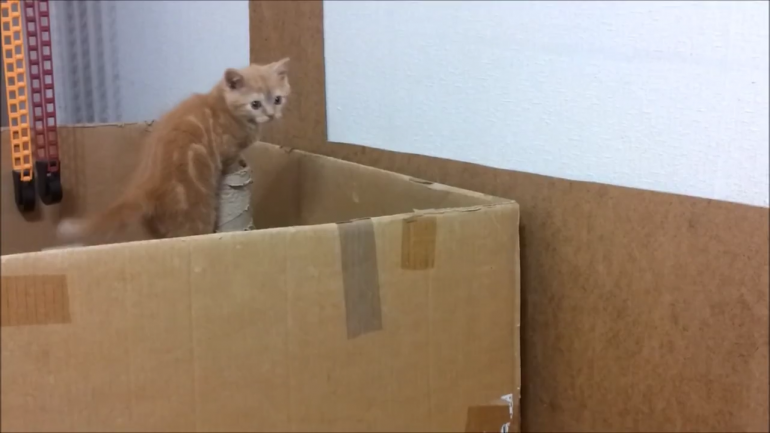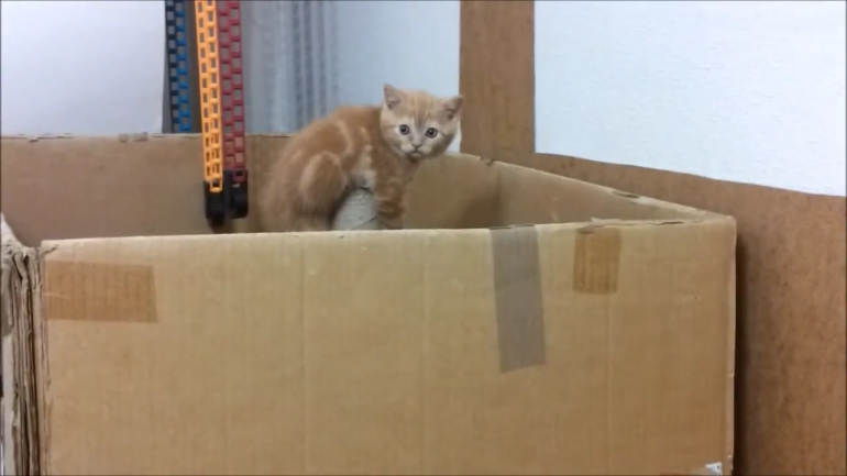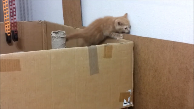 ダンボールの真ん中の筒の上で、困り顔の子ネコちゃん。