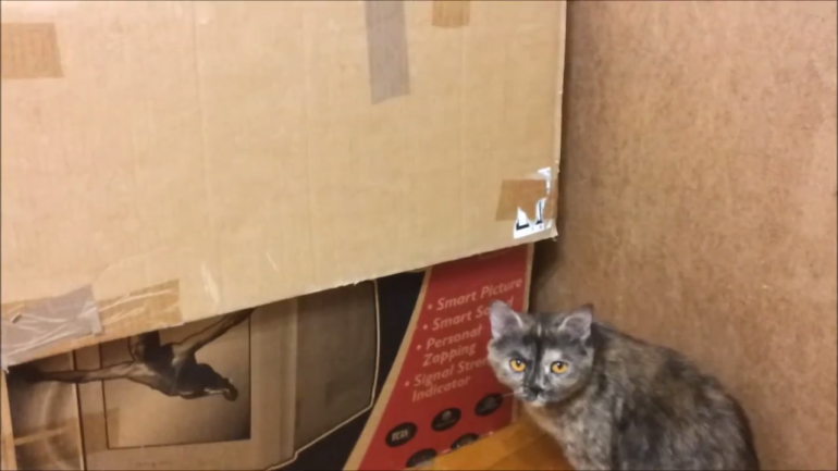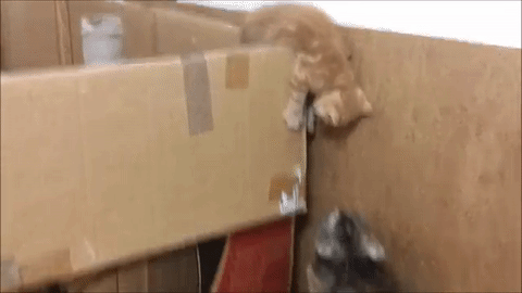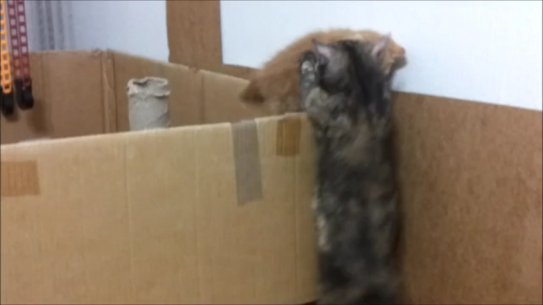 ダンボールの下ではおかあさんネコが待ち構えているみたい。