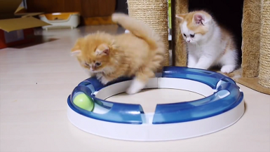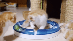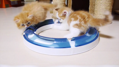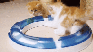 丸いレールをじっと見つめるマンチカンちゃんたち。