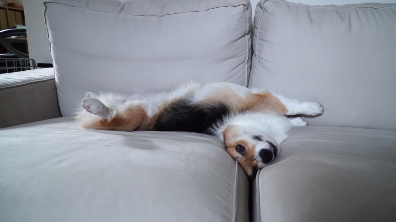 コーギーの林檎ちゃん、いつの間にかソファーでお昼寝( ˘ω˘ )