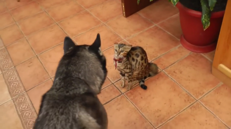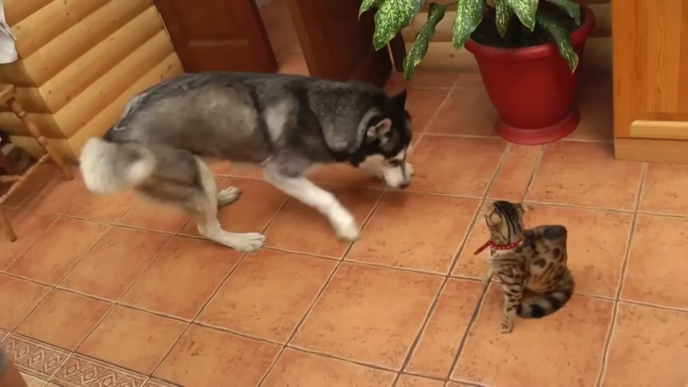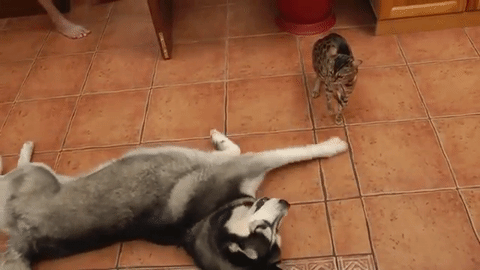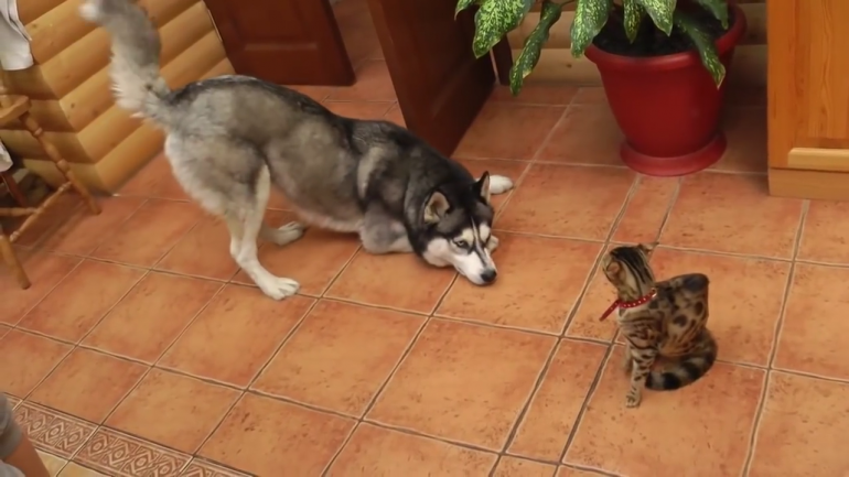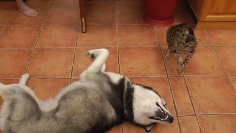 ねこさんと遊びたくてしょうがないハスキーくん。