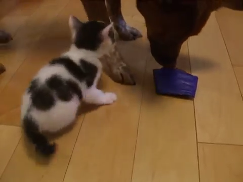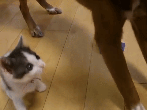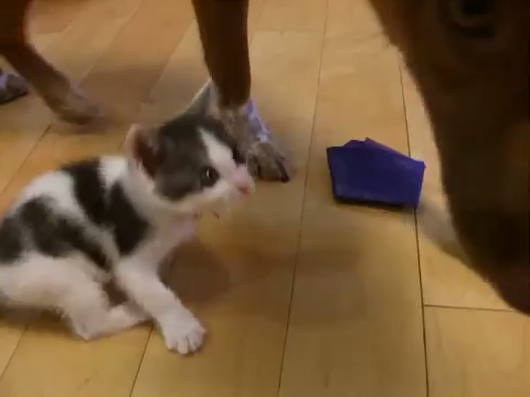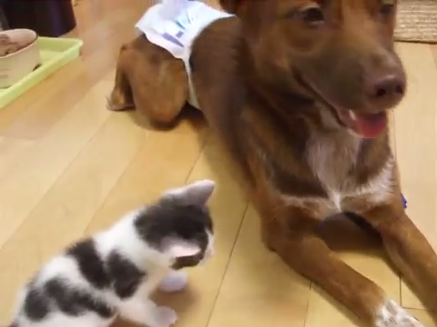 小さいながらも必死で抵抗するミーちゃん、とぼけた様子のワンちゃん…。