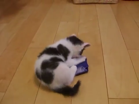 青い袋をおもちゃにして遊んでいるミーちゃん。