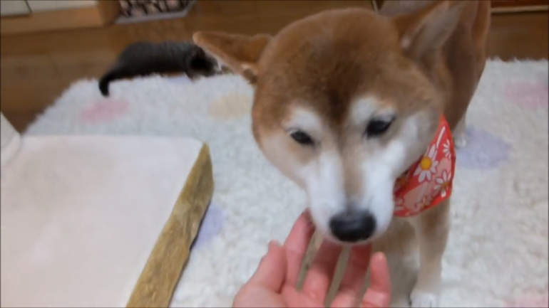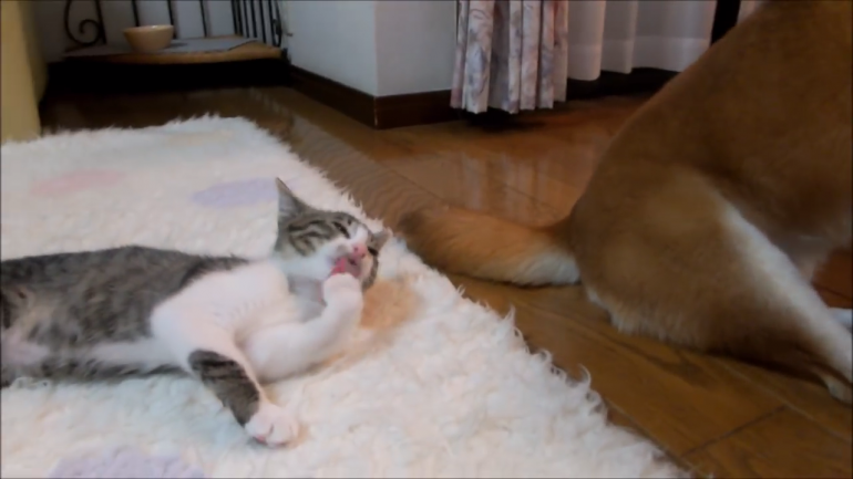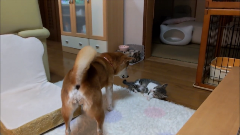 かまってほしい様子の子猫ミルキーにとまどう柴犬ヒカリ。