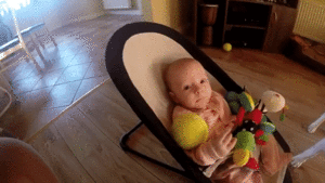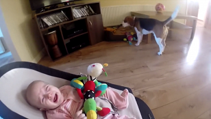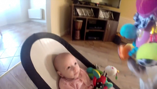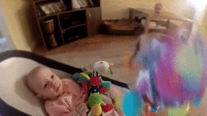 おもちゃに埋もれた赤ちゃん、最後はすっかり泣き止んでくれました。
