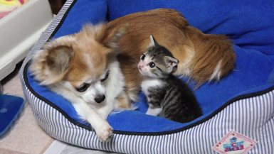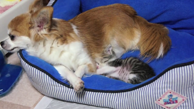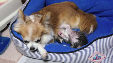 ココちゃんのベッドで一緒にくつろぐ子ねこのおはぎちゃん。