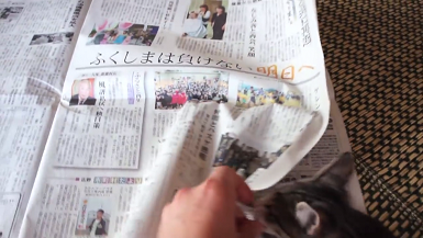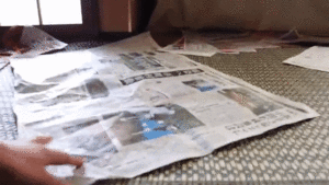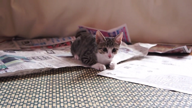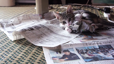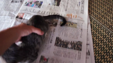 バラバラの新聞紙の上で、嬉しそうなおはぎちゃん。