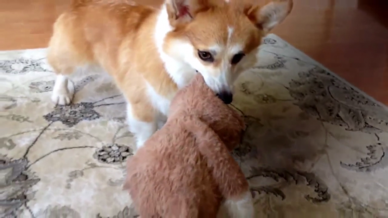 クマちゃんをくわえたまま上目遣いのコーギーくん。