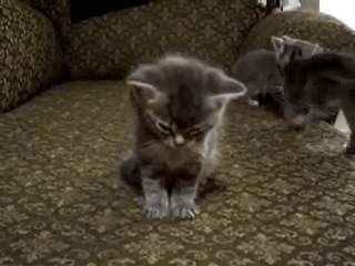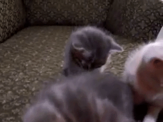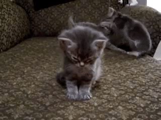 後ろで遊ぶ子ネコちゃんがソファから「ドテンッ」と落ちても・・・