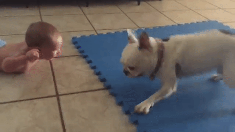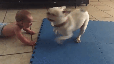 なんだか得意げなワンちゃんと、大喜びの赤ちゃん。