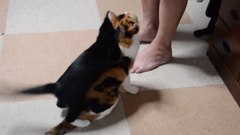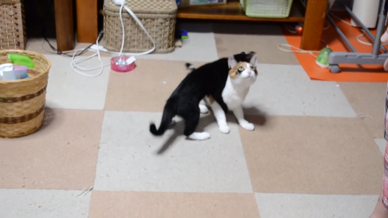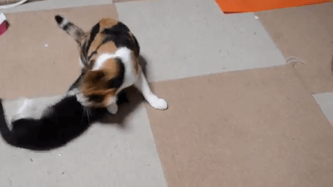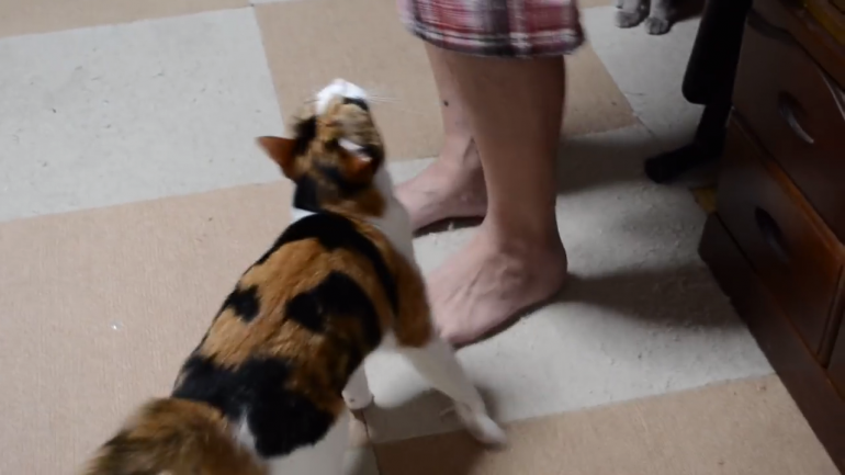 飼い主さんに抱っこしてほしいミミちゃんと、ミミちゃんに遊んでほしそうなソックスちゃん。