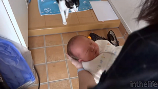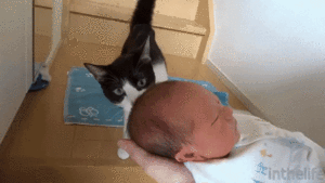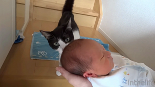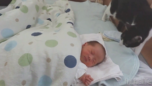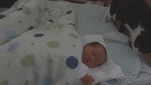 興味深そうに、赤ちゃんのニオイをかぎますが…