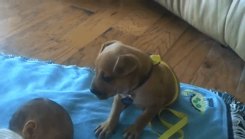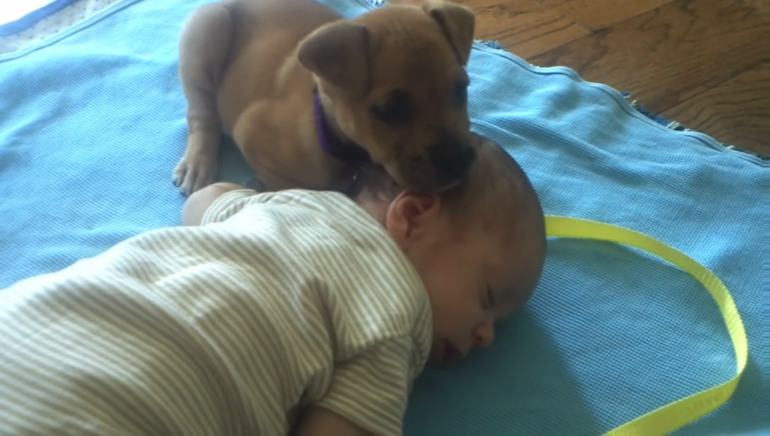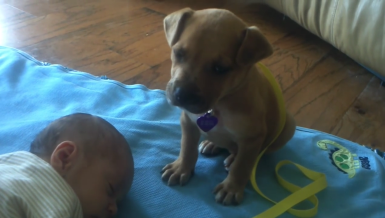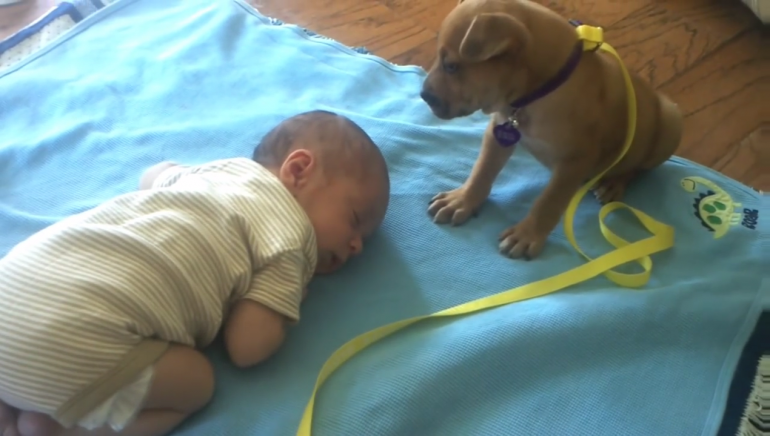 赤ちゃんをやさしく見守るワンコのカーリーちゃん。