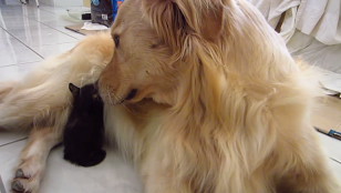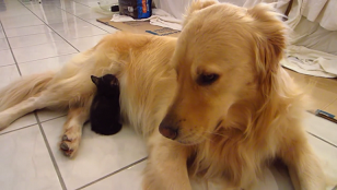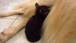 フォスターくんのおなかにスポッと埋まっているのは、生後3週間の子猫ちゃん♡