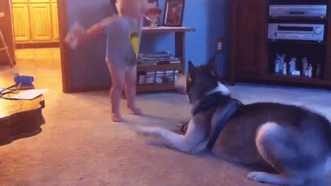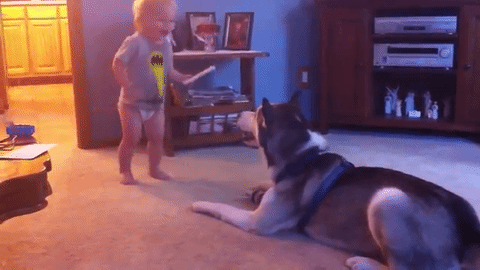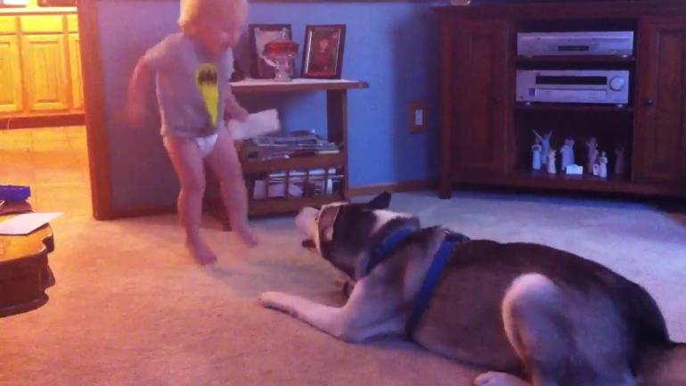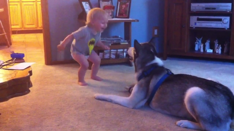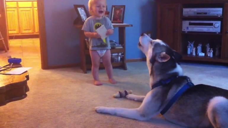 赤ちゃんにハスキーちゃんもくぎづけ♪