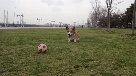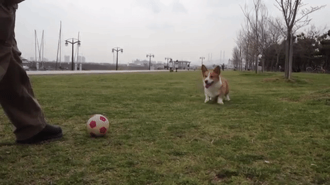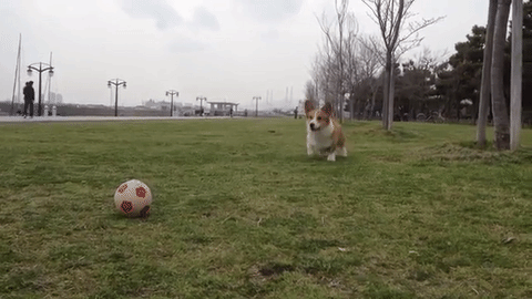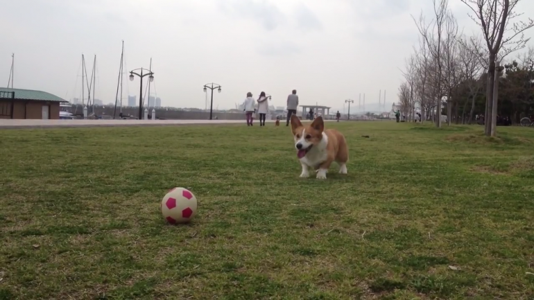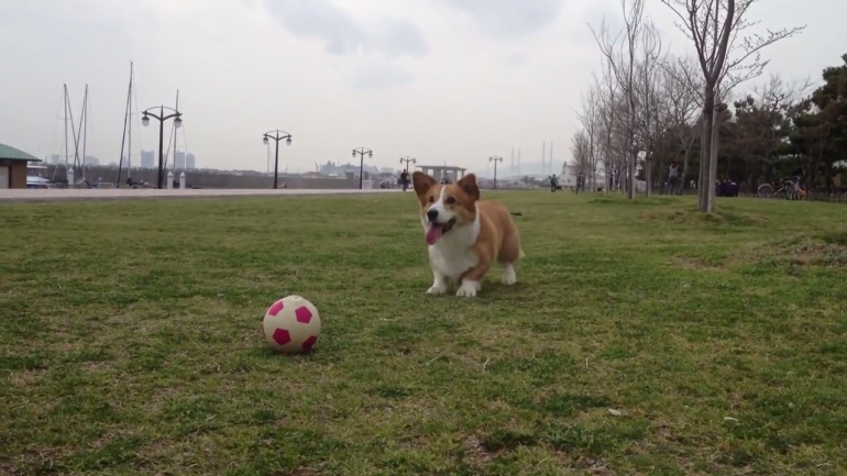 公園で飼い主さんと一緒にサッカーの練習中のワンちゃん。