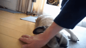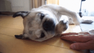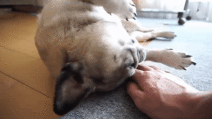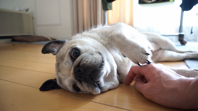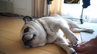 床に寝転がるパグのじょるちゃん。