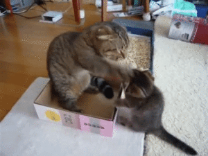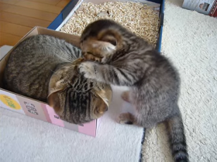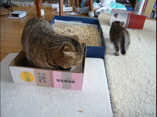 空箱でくつろぐお父さんネコのもとへ…
