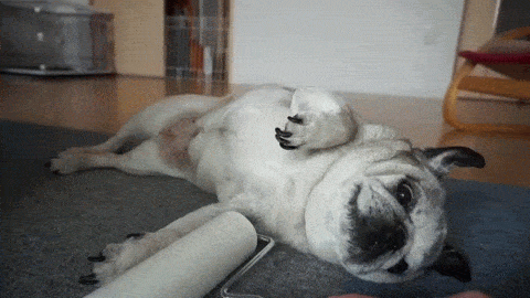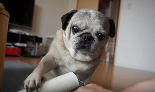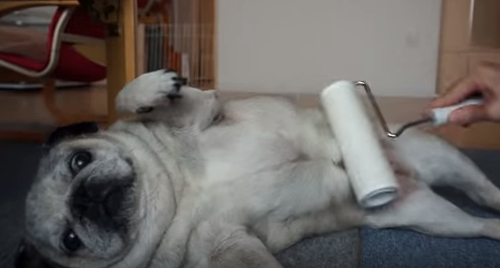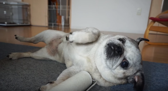 ご主人様にコロコロでなでられて、ご満悦のパグちゃん。