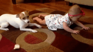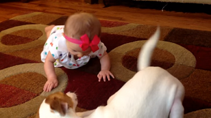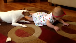 赤ちゃんをみつめる、ジャックラッセルテリアのバディ。