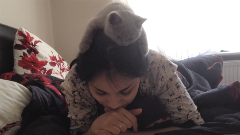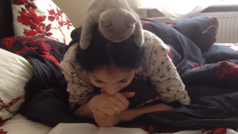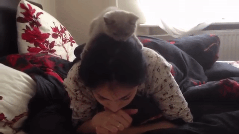 ご主人さまの頭の上でまねっこするにゃんこ。